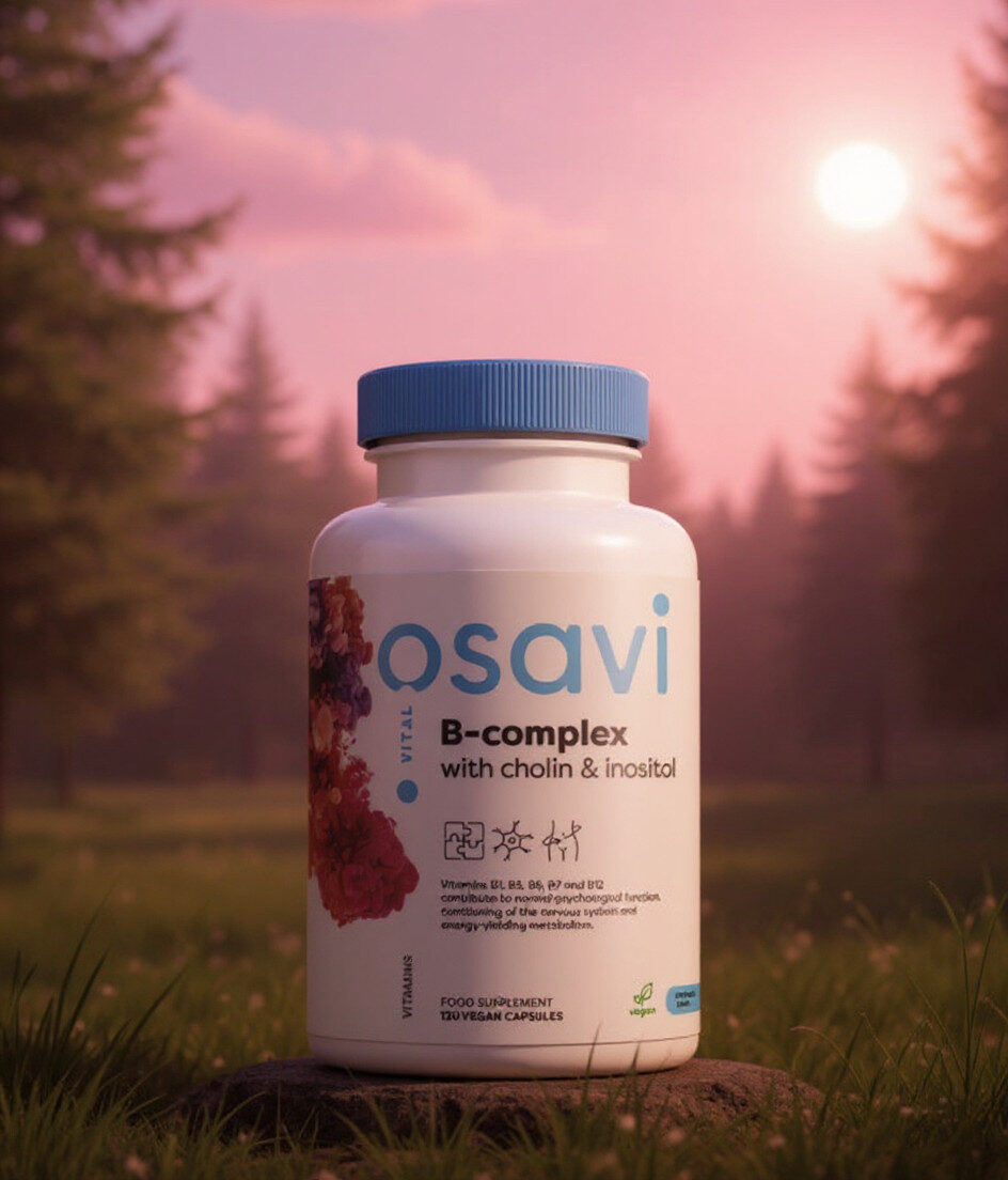 Ingredienser per kapsel: Tiamin (vitamin B-1) (som benfotiamin) 25 mg 1667%, Riboflavin (som riboflavin 5′-fosfat) 25 mg 1,471%, Niacin (som nicotinamide) 25 mg 250%, Vitamin B-6 (som pyridoxalt 5-fosfat) 10 mg 1,250%, Folat (metylfolat)200 mcg, Vitamin B-12 (som metylkobalamin) 100 mcg 4,167%, Biotin 100 mcg 8%, Kolin (som kolinbitartrat) 25 mg *, Vitamin B5 (calcium-d -pathenate) 50 mg *, Inositol (från inositolhexanikotinat) 12,5 mg *, risfiber, inulin och cellulosakapsel