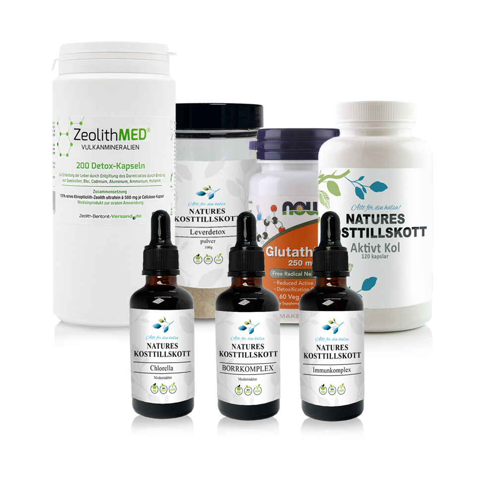 Detta ingår i protokollet: Borrkomplex 1 liter, Immunkomplex 500 ml, Zeobent 2 st, Aktivt kol 3 st, Glutatione 4 st, Leverdetox pulver 3 st, Chlorella modertinktur 100 ml.