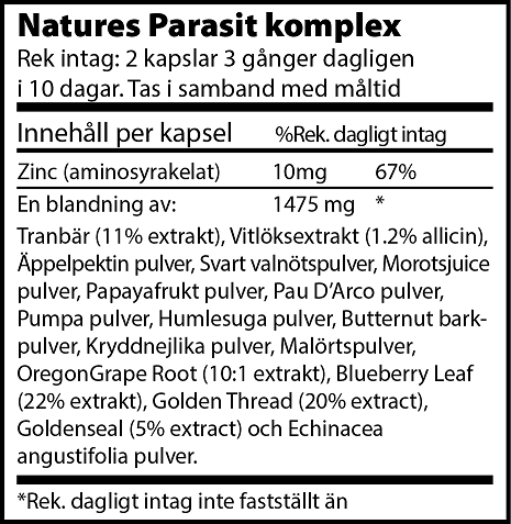 Natures Parasit Komplex är en stark blandning som ska tas som en kur på 10 dagar. Repeteras efter ca 2-3 veckor om det skulle behövas.