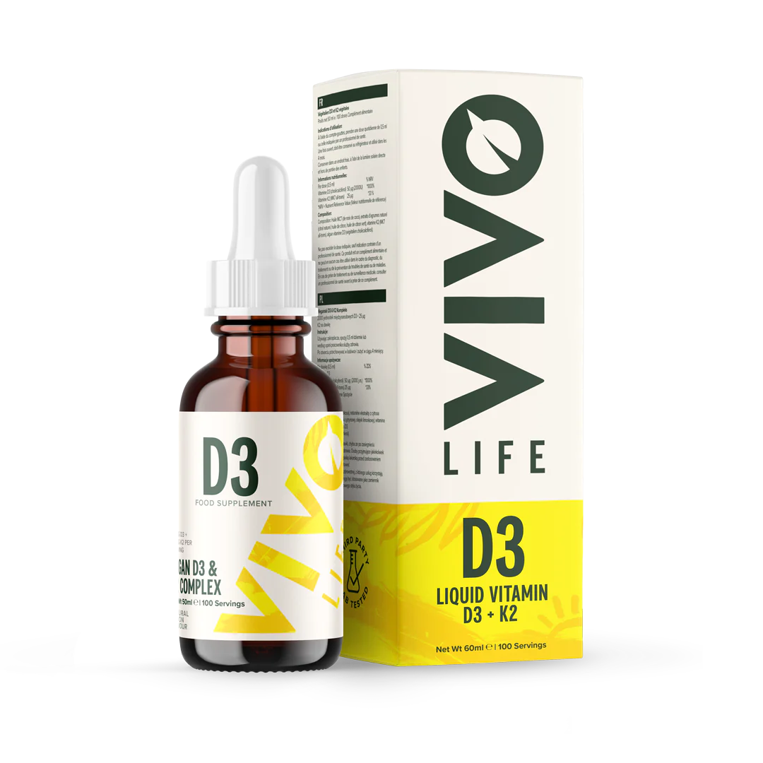 Kosttillskott Vitamin D3 med K2 där vitamin D3 kommer från alger. Både vitamin D3 och K2 är essentiella för kalciumupptaget.